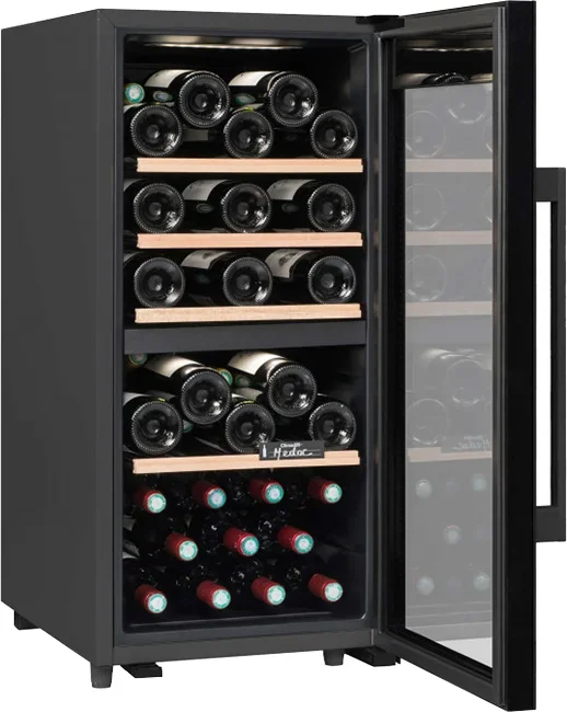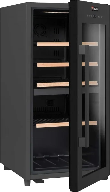 Вместимость до 41 бутылки по 0,75 л и общий объем 90 литров делают прибор удобным для небольшой коллекции. Стеллажи выполнены из металла и дерева, сочетая прочность и аккуратный внешний вид, а конструкция полок допускает перестановку для размещения емкостей нестандартных форматов. LED-подсветка равномерно освещает содержимое без нагрева, что улучшает визуальную оценку этикеток и создает презентабельную экспозицию. Стеклянная дверца с UV-защитой помогает уберечь вино от воздействия солнечных лучей и сохраняет премиальные свойства напитков.