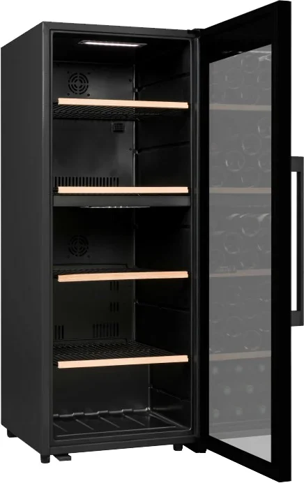 Полки комбинированные: металл несёт прочность, а деревянные элементы уменьшают вибрации и эстетично смотрятся при демонстрации вин. Четыре выдвижных полки упрощают доступ к бутылкам и позволяют удобно разложить коллекцию по сортам или годам. Встроенные амортизаторы минимизируют вибрационные колебания, что важно для выдержанных вин с осадком. Регулируемые ножки упрощают установку на неровной поверхности и улучшают герметичность дверцы.
