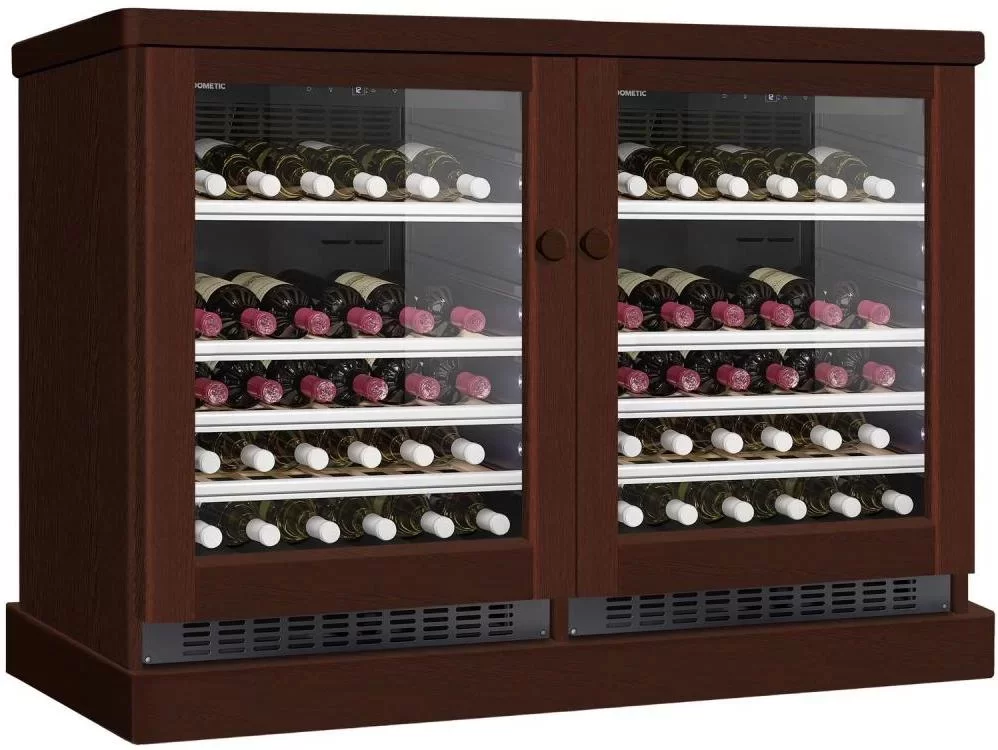 Винный холодильник Dometic C50G Double Wooden Walnut имеет две температурные зоны, в которых одновременно можно хранить разные сорта алкоголя и выставлять разные сочетания настроек. Он устанавливается отдельно, что удобно, если у вас есть специальное помещение — кладовая, погреб и т.д. Количество бутылок, которое можно разместить с учетом полной комплектации и из расчета объема бутылки 0,75 л, — 100 шт.
