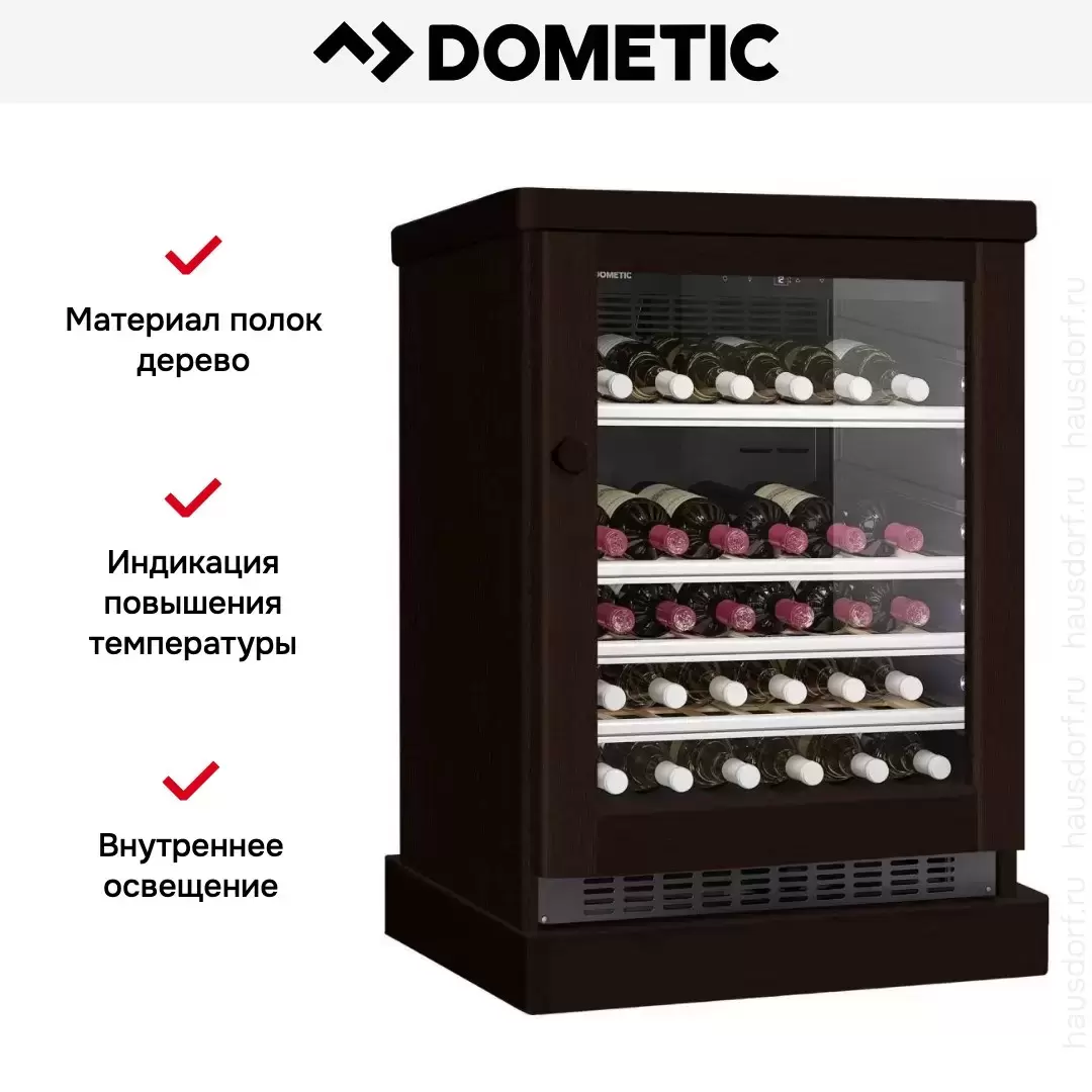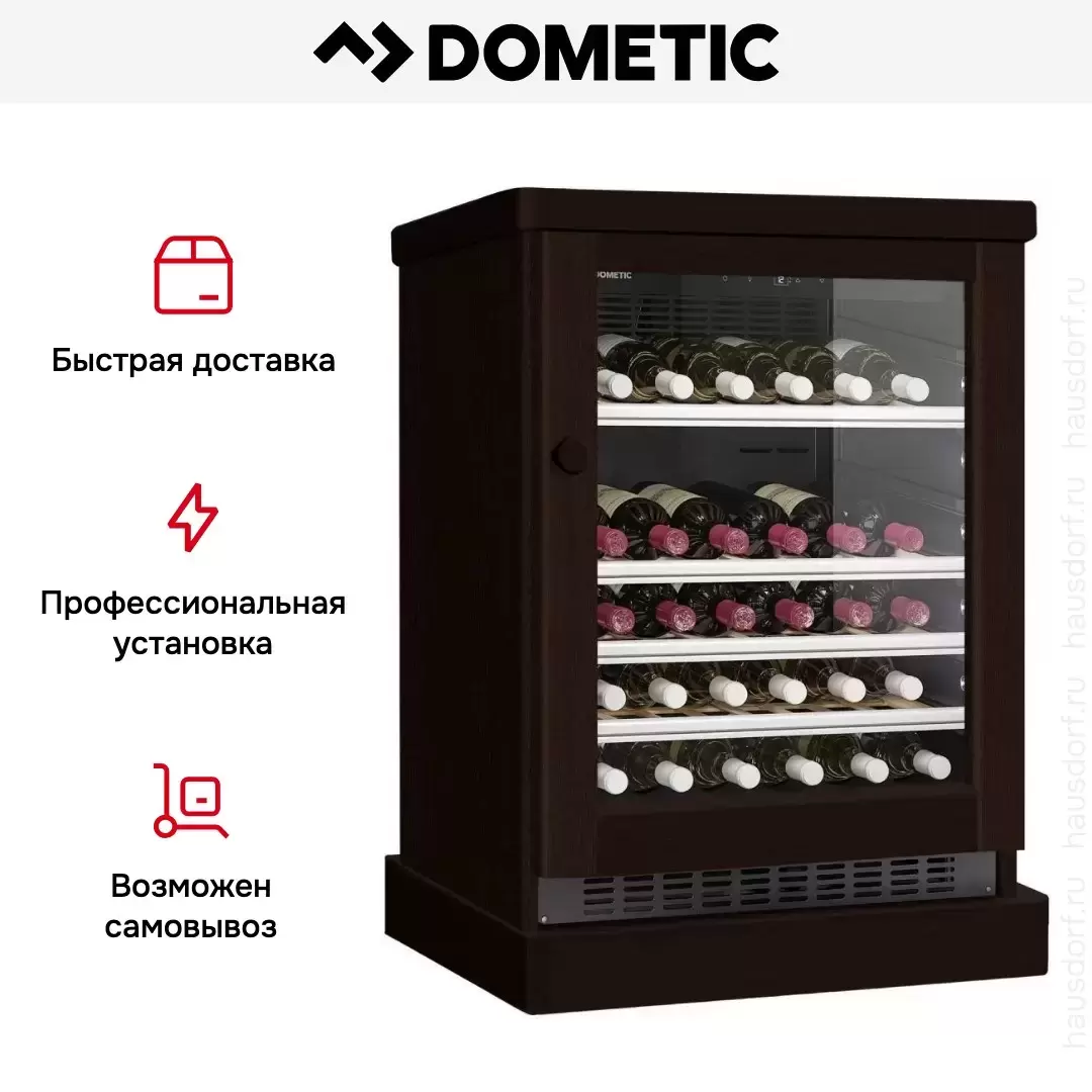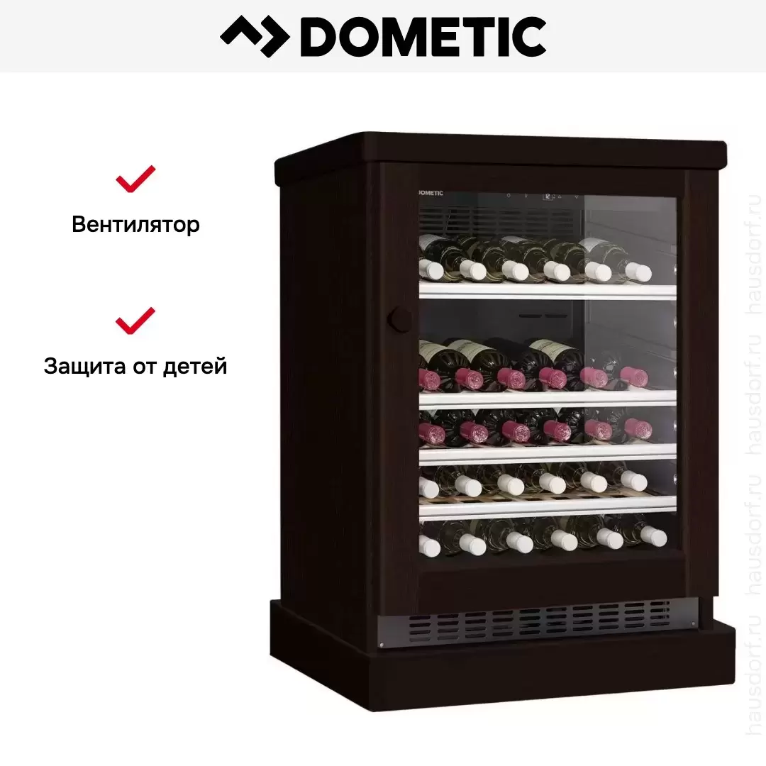 Винный холодильник Dometic C50G Wooden Wenge имеет одну температурную зону, в которой можно разместить бутылки и единовременно выставить только одну комбинацию настроек. Он устанавливается отдельно, что удобно, если у вас есть специальное помещение — кладовая, погреб и т.д. Количество бутылок, которое можно разместить с учетом полной комплектации и из расчета объема бутылки 0,75 л, — 50 шт.