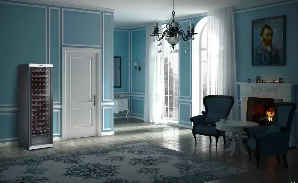 Стеклянная дверь — дополнительный изящный штрих к общему дизайну модели. Специальное покрытие защищает вино от влияния ультрафиолетовых лучей, которые проникают, если шкаф находится в солнечной комнате. Хранение становится еще безопаснее и герметичнее благодаря нескольким слоям стекол. Цвет корпуса — серебристый.