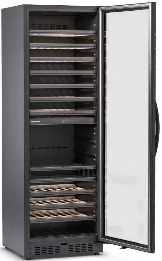 Винный холодильник Dometic E115FG Gold имеет две температурные зоны, в которых одновременно можно хранить разные сорта алкоголя и выставлять разные сочетания настроек. Он устанавливается отдельно, что удобно, если у вас есть специальное помещение — кладовая, погреб и т.д. Количество бутылок, которое можно разместить с учетом полной комплектации и из расчета объема бутылки 0,75 л, — 115 шт.