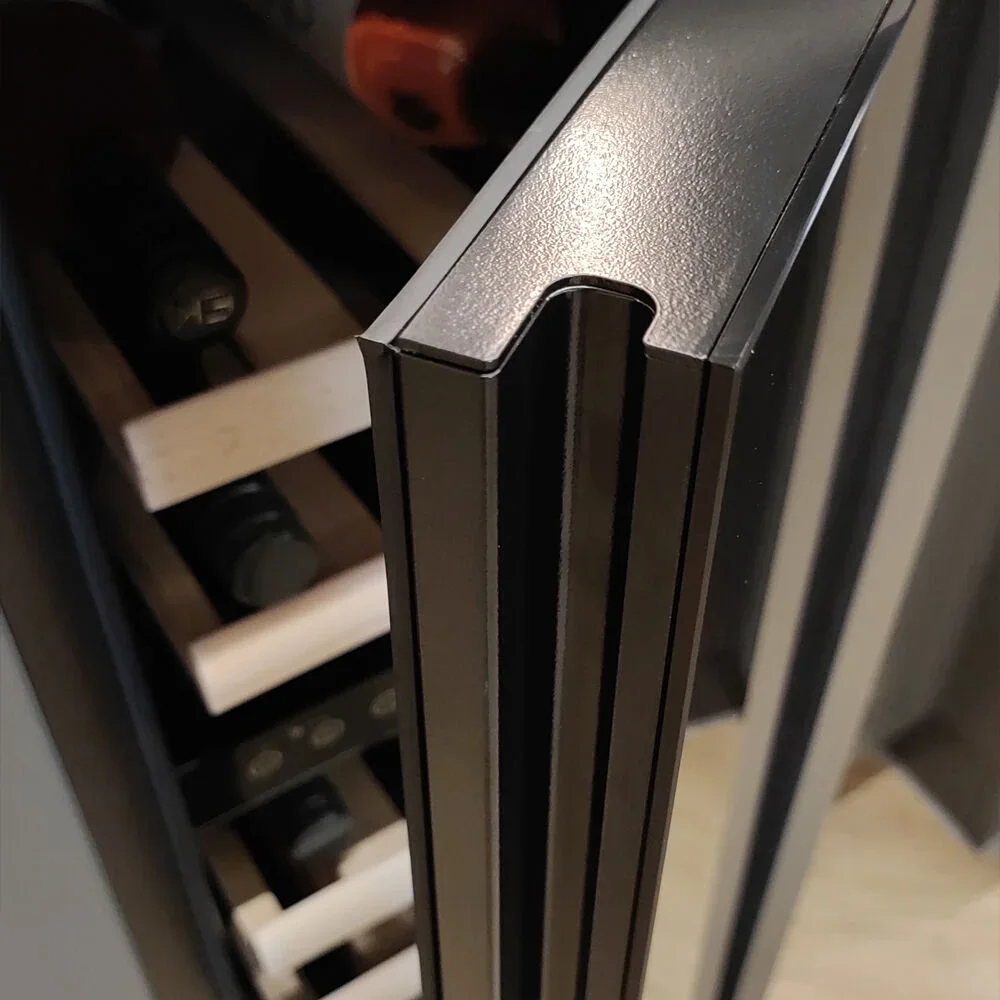 Оформление винного шкафа подчинено идее минимализма. Чистые линии, отсутствие лишних деталей и строгость чёрного цвета создают ощущение порядка и спокойствия. Внутреннее пространство подсвечено мягким белым светом — он не искажает оттенки бутылок и не привлекает лишнего внимания.