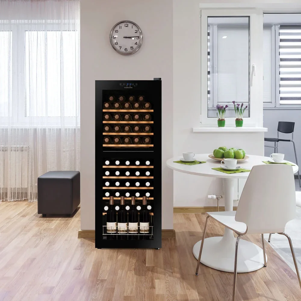 Холодильник оснащен утопленной дверной ручкой, что придаёт ему изящный вид и упрощает процесс открытия. Прочные деревянные полки надежно удерживают бутылки на месте, предотвращая их вибрацию, а специальная демонстрационная полка позволяет красиво разместить лучшие экземпляры вашей коллекции.
