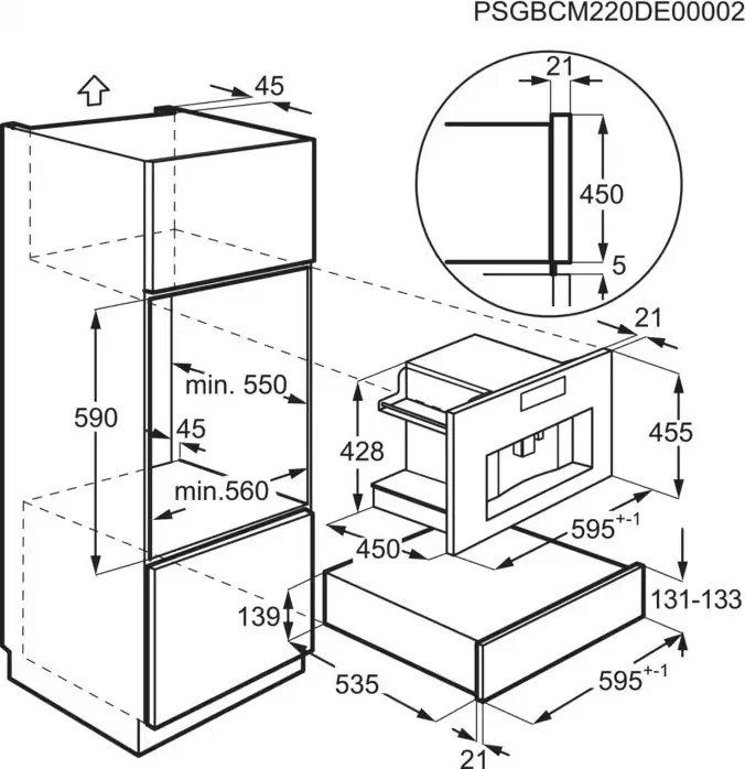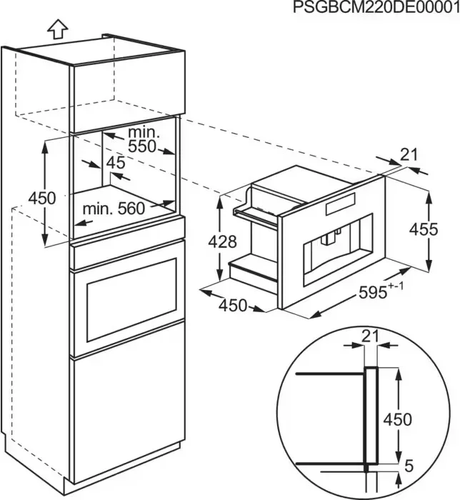 Габариты прибора — 45,5 см в высоту, 59,5 см в ширину и 45 см в глубину — соответствуют стандартным размерам кухонных ниш. Для корректной установки требуется ниша размером 45×56×55 см (Ш×В×Г), что делает интеграцию простой и безопасной. Встроенная модель не только экономит место, но и защищена от пыли и брызг, что продлевает срок её службы и упрощает уход.