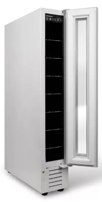 Корпус в белом цвете и узкая фронтальная панель шириной 15 см делают аппарат незаметным в интерьере и удобным для размещения в небольшой нише. Стеклянная дверь с тонировкой и защитой от УФ-излучения бережёт напитки от вредного света, а накладная ручка и правый дверной упор упрощают доступ и монтаж в стандартных конфигурациях кухонного гарнитура.