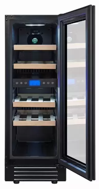 Дверь со стеклопакетом защищена от ультрафиолета и оснащена тонировкой, что снижает вредный световой поток и сохраняет аромат урожая. Скрытая ручка и аккуратные линии делают прибор ненавязчивым элементом интерьера. Внутри четыре деревянные полки щадяще фиксируют бутылки и предотвращают вибрацию, а мягкое внутреннее освещение облегчает выбор без резкого нагрева содержимого.