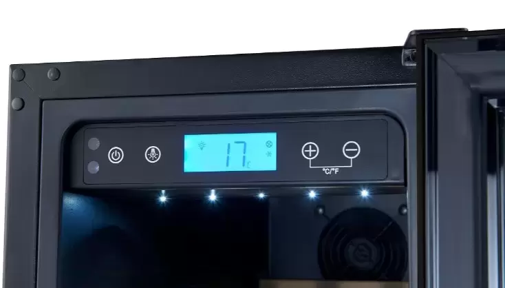 Сенсорное управление и читаемый дисплей упрощают настройку и контроль. Внутреннее освещение делает подбор бутылки удобным без длительного открытия дверцы. Дверной упор справа можно перенавесить, что увеличивает гибкость в планировке кухни.