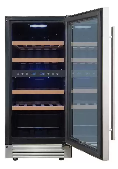 Это двухтемпературный прибор с одной камерой и двумя независимыми зонами, каждая из которых управляется отдельно. Верхняя область регулируется в пределах 5-12 °C, что идеально для белых и игристых сортов. Нижняя зона рассчитана на 12-20 °C, здесь удобно хранить и слегка охлаждать красные вина. Диапазон установки 5-20 °C позволяет точно задавать параметры для разных стилей напитков. Сенсорное управление и встроенный дисплей упрощают настройку и дают быстрый доступ к значениям.