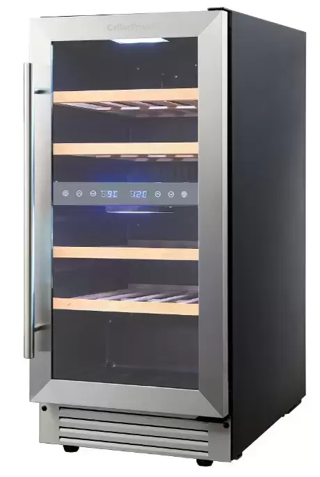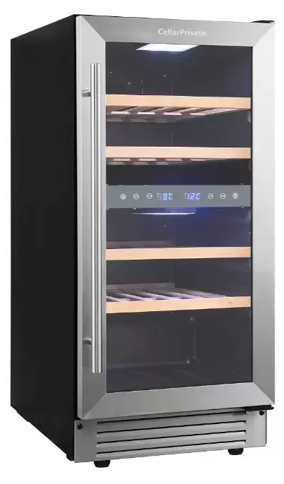 Винный шкаф CellarPrivate CP027-2T впечатляет лаконичным металлическим обликом и продуманной встраиваемой конструкцией. Его компактные габариты 82×38×58 см помогут органично вписать аппарат в кухонную колонну или под столешницу. Для монтажа предусмотрена ниша размером 82.5×39×61 см, а аккуратная накладная ручка делает переднюю панель визуально легкой. Дверь со стеклопакетом тонирована и защищена от УФ-излучения, что сохраняет цвет и аромат напитков. По умолчанию дверной упор справа, но возможность перенавешивания дает свободу выбора стороны открывания.