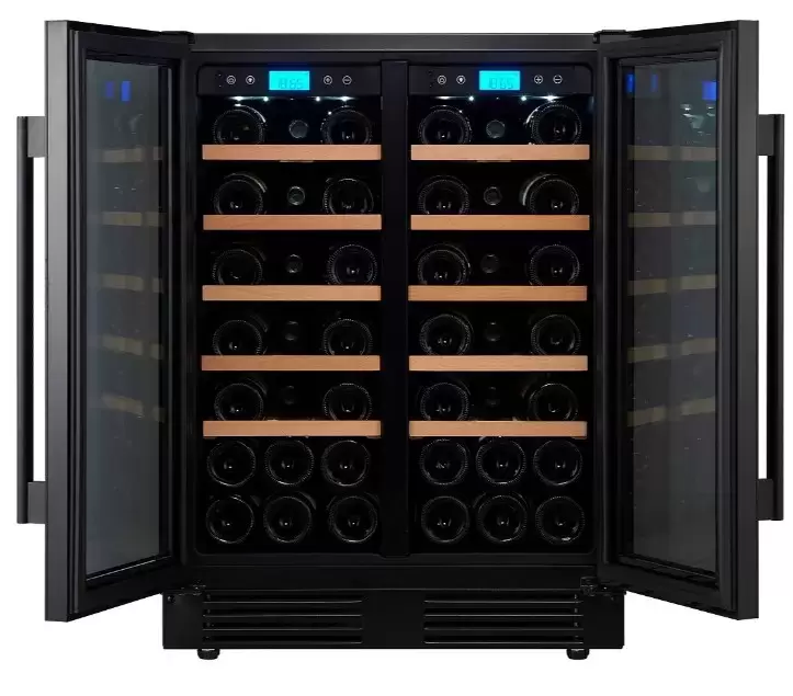 Шкаф рассчитан на 42 бутылки по 0,75 л и имеет полезный объем 126 литров. Десять деревянных полок мягко фиксируют емкости и уменьшают вибрации, что важно для бережного хранения. Дерево не впитывает холод так быстро, как металл, и создает благоприятные условия для выдержки. Двойные двери модели с дверным упором Side-by-Side упрощают доступ к каждой зоне хранения, а вес в 45 кг обеспечивает устойчивость после встраивания.