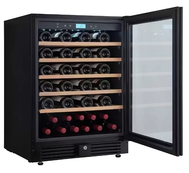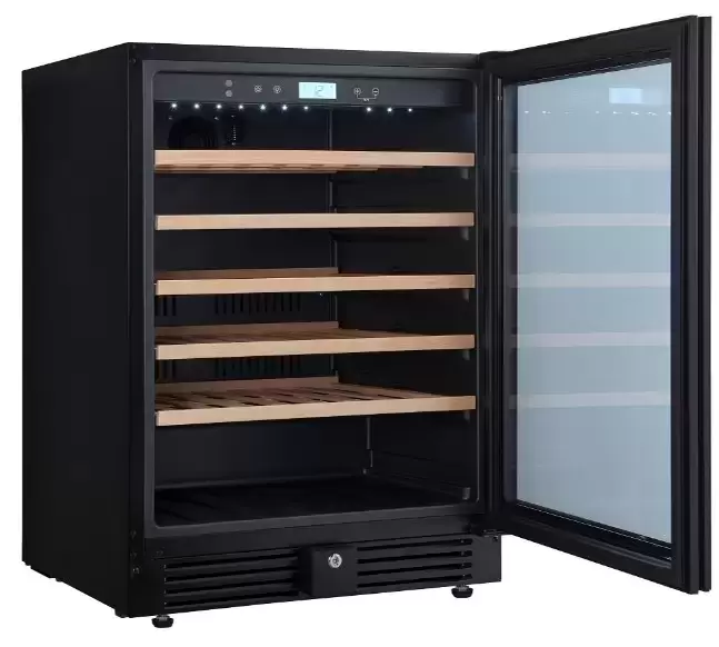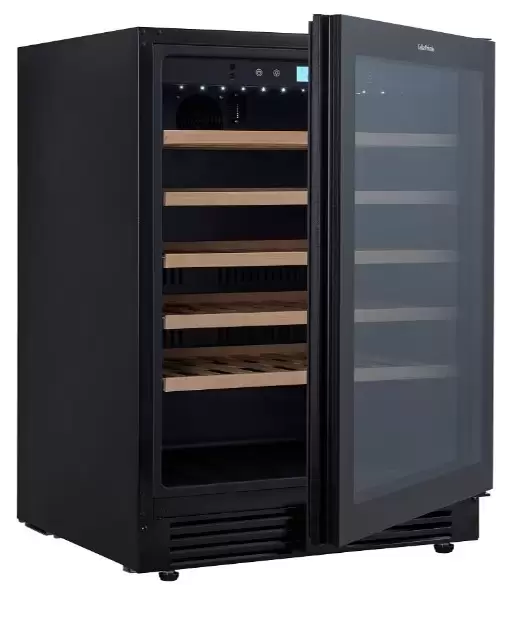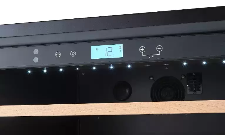 Внутреннее наполнение ориентировано на бережное обращение с бутылками: пять деревянных полок гасят вибрации и минимизируют контакт пробки с холодной поверхностью. Активная вентиляция и угольный фильтр поддерживают оптимальную циркуляцию воздуха и снижают посторонние запахи, что важно при долгом хранении. Встроенная подсветка позволяет удобно выбирать бутылки в темное время суток, а общий запас в 51 стандартную бутылку 0,75 л покрывает потребности как домашней коллекции, так и небольшой дегустационной зоны.