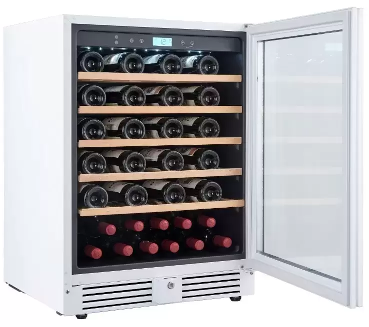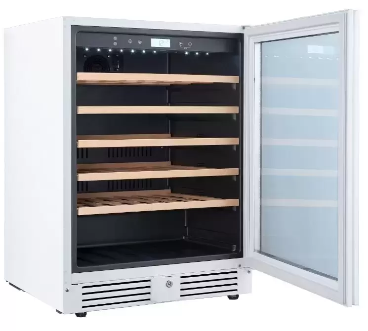 Внутреннее пространство рассчитано на 51 бутылку формата 0,75 л и полезный объем 136 литров. Пять деревянных полок аккуратно удерживают бутылки и минимизируют вибрации при извлечении, сохраняя целостность пробок и этикеток. Монотемпературный режим с одной зоной легко поддерживает стабильную среду для длительного хранения или выдержки, если вам нужно концентрироваться на одном типе вина.