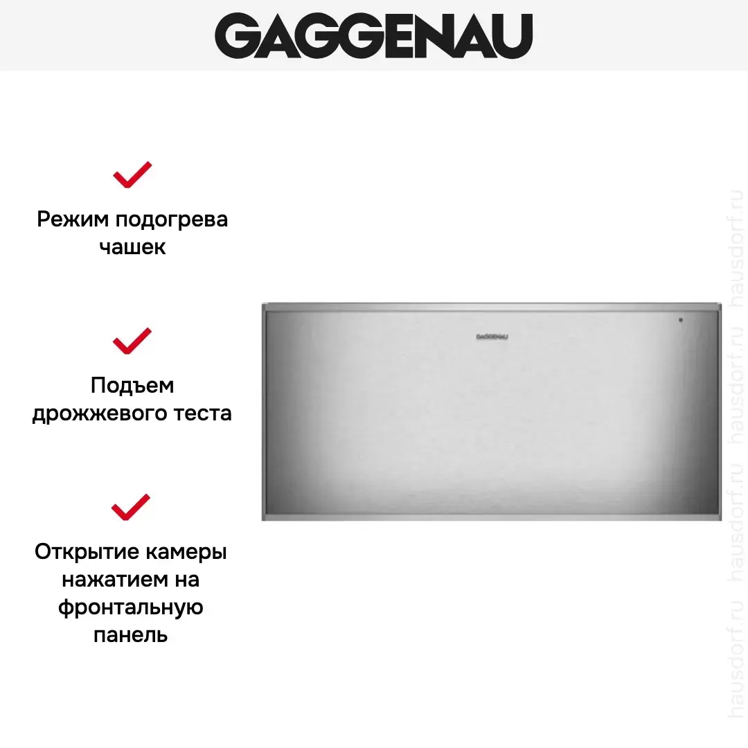 Модель Gaggenau WS 462-110 предназначена для подогрева посуды (необходимо при подаче сложных блюд или подготовке торжества), а также обработки продуктов. Один из основных вариантов использования — прогрев тарелок, который предотвращает изменения вкуса или текстуры ресторанных порций. Также с помощью этого прибора можно поднять температуру на поверхности чашек, чтобы свежесваренный кофе полностью сохранил свои качества. Общее количество режимов работы — 4 шт. Вы можете самостоятельно регулировать температуру в зависимости от своей цели.