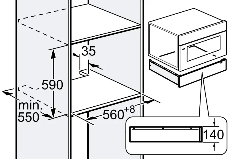 Конструкция предусматривает возможность установки непосредственно под другие приборы бренда в нише шириной 59 см без промежуточной полки, что значительно экономит пространство и упрощает монтаж. Розетку можно расположить прямо за устройством, что особенно удобно при планировке современной кухни.