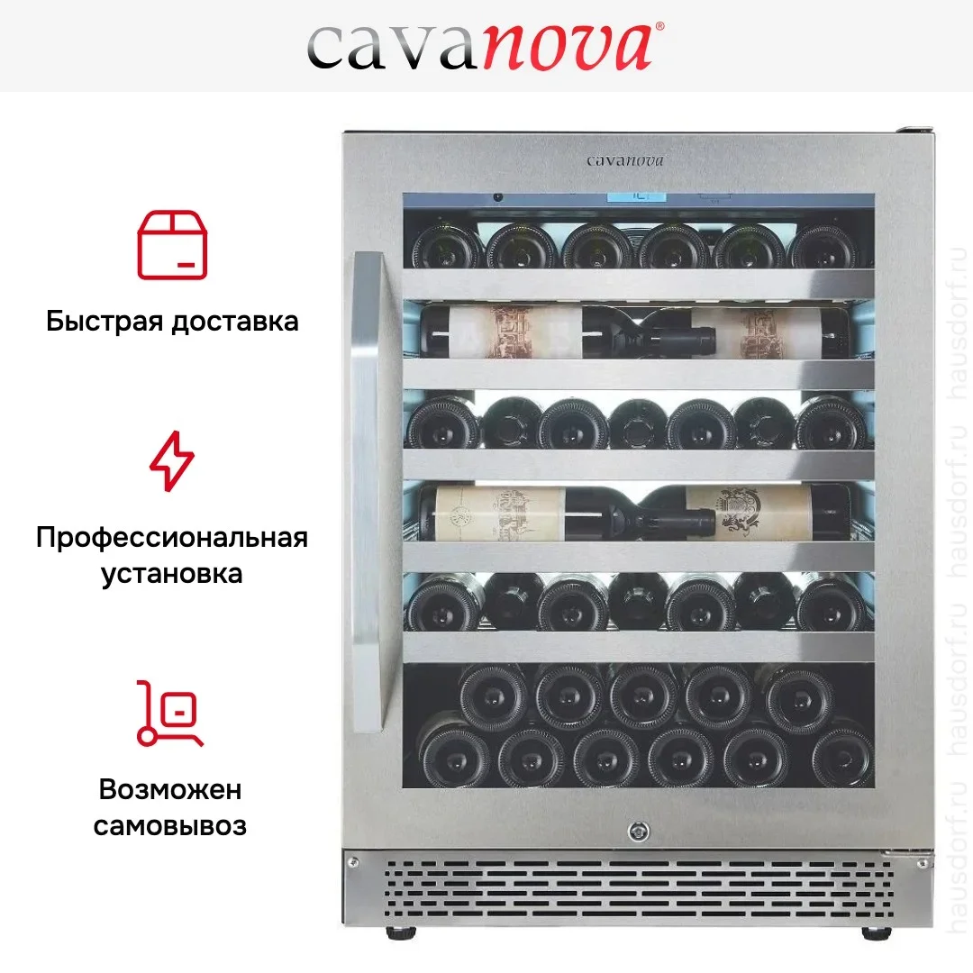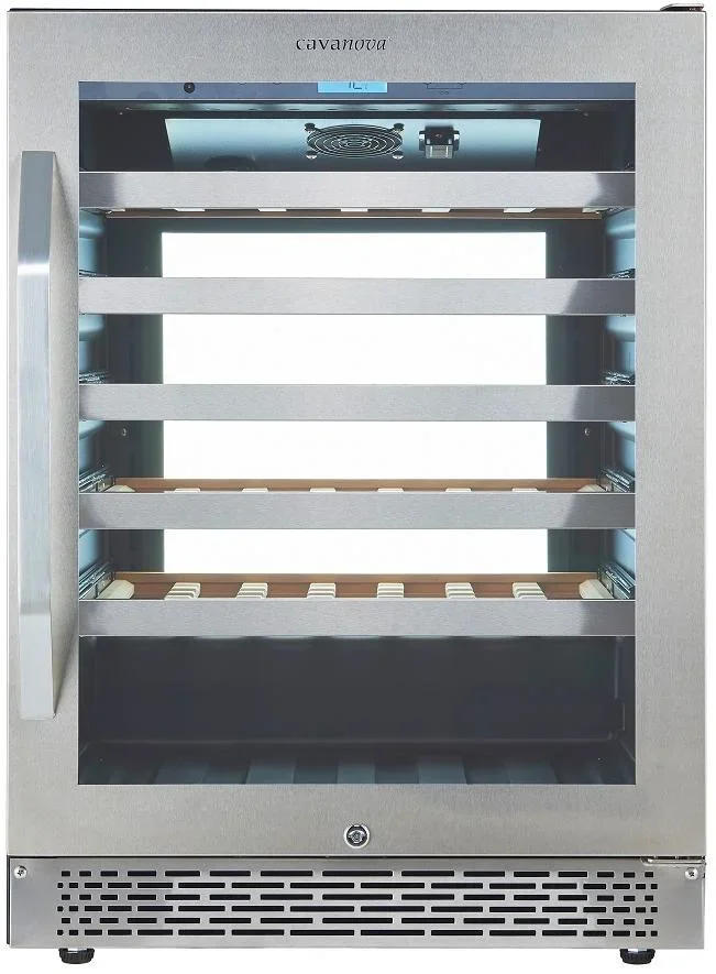 Встраиваемый винный шкаф Cavanova CV045-1TL сочетает аккуратный серебристый фасад в стальной рамке и компактные габариты 82×59,5×57,5 см, что делает его идеальным решением для встраивания в кухонный гарнитур или барную стойку. Практичный накладной профиль ручки и правый дверной упор задают удобство открывания, а черный корпус из металла обеспечивает надежную основу и стильный контраст со стеклянной дверью. Двойное остекление с тонировкой и УФ-защитой сохраняет цвет и букет бутылок, уменьшая вредное воздействие света на содержимое.