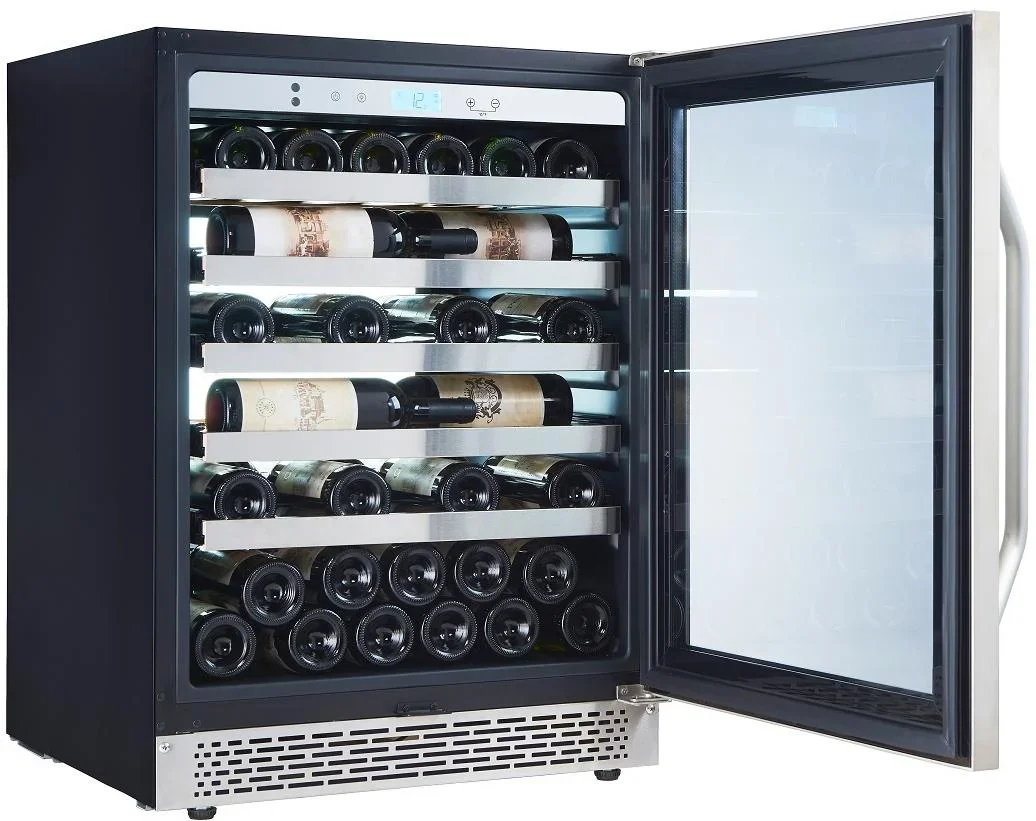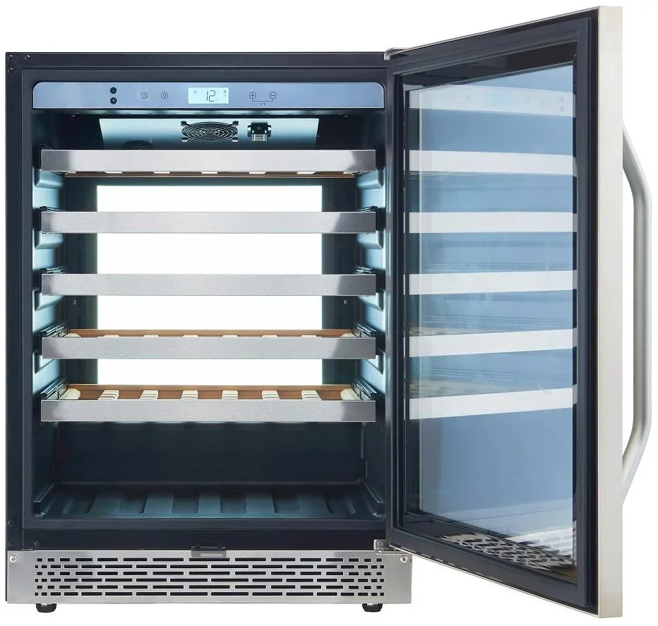 Интерьер продуман для бережного хранения: пять выдвижных деревянных полок с металлической окантовкой мягко держат бутылки и предотвращают скольжение, а съемный конструктив облегчает перестановку и чистку. Внутреннее светодиодное освещение аккуратно подсвечивает содержимое без нагрева, а вентиляция поддерживает стабильный микроклимат при встраивании. Защита от вибраций снижает риск повреждения осадка в бутылках, особенно при длительном хранении и выдержке.