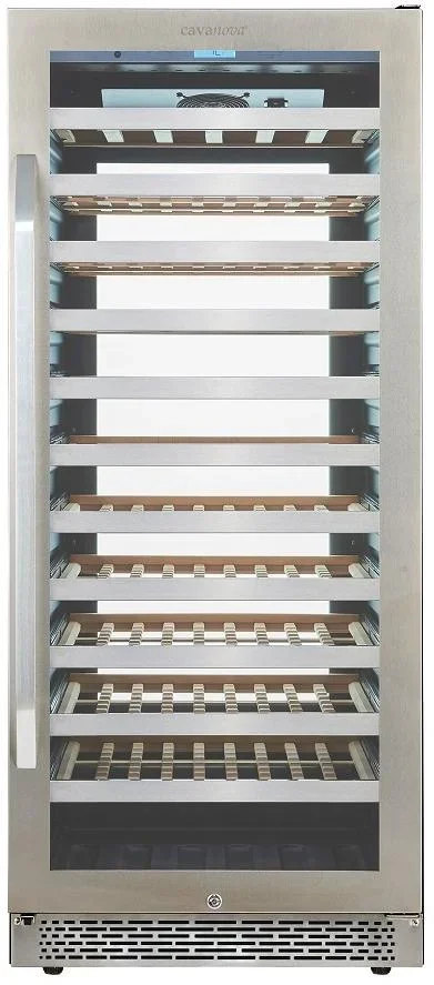 Внутреннее пространство объёмом 326 литров рассчитано на 102 стандартные бутылки 0,75 л и организовано одиннадцатью выдвижными полками из натурального дерева с металлической окантовкой. Деревянные лежаки гасят микровибрации и минимизируют контакт бутылок с холодной поверхностью, что бережно относится к пробкам и этикеткам. Металлическая окантовка усиливает прочность полок, а возможность их съёма и перестановки даёт гибкость для хранения бутылок нестандартной длины и форм.
