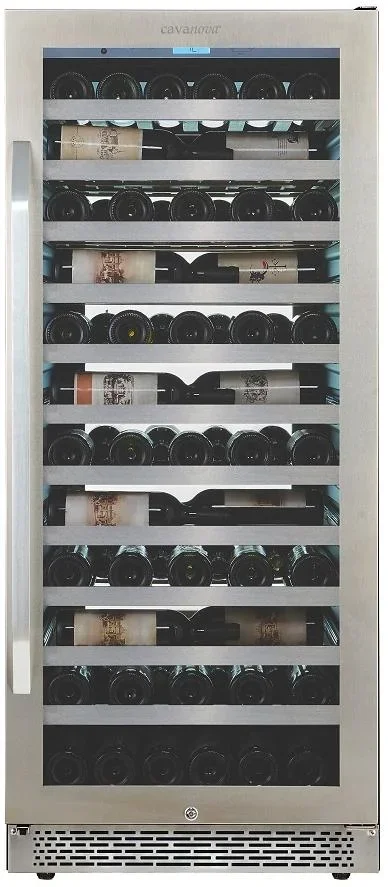 Винный шкаф Cavanova CV102-1TL — продуманное решение для встраиваемого хранения бутылок с элегантной фронтальной панелью серебристого оттенка и контрастным чёрным корпусом. Корпус выполнен из металла, а дверца установлена в стальной рамке и имеет двойное стекло с тонировкой и защитой от ультрафиолета. Правый дверной упор и накладная ручка обеспечивают удобный доступ при стандартной установке, а габариты 140×59.5×67.5 см позволяют гармонично встроить прибор в кухонный модуль или барную стойку.