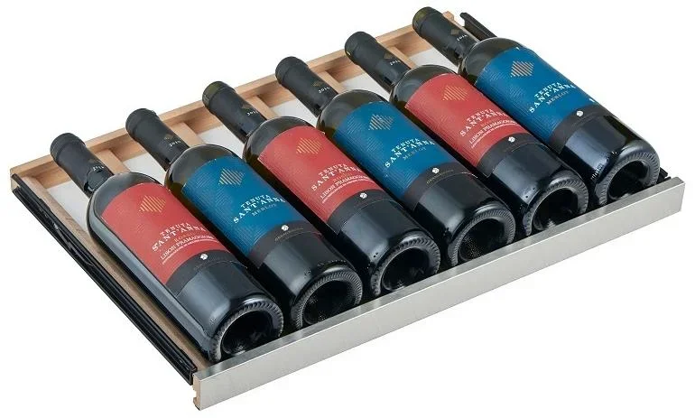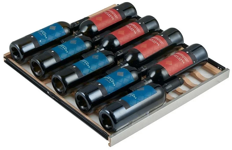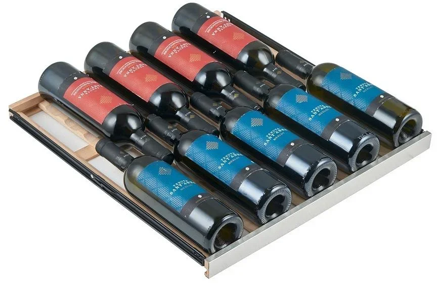 Внутреннее пространство емкостью 424 литра рассчитано на 135 бутылок по 0,75 л. Всего 14 выдвижных полок из дерева с металлической окантовкой аккуратно размещают бутылки и предотвращают их скольжение. Съемные рейки позволяют адаптировать внутреннее пространство под крупные форматы или специальные позиции. Светодиодная подсветка освещает содержимое без лишнего нагрева, а вентиляция обеспечивает свежий воздух и стабильность влажности внутри.