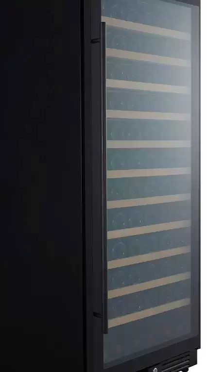 Стеклянная дверь — дополнительный изящный штрих к общему дизайну модели. Специальное покрытие защищает вино от влияния ультрафиолетовых лучей, которые проникают, если шкаф находится в солнечной комнате. Цвет корпуса — черный. Дверь можно перевесить на другую сторону, поэтому вариантов размещения его в доме становится больше.