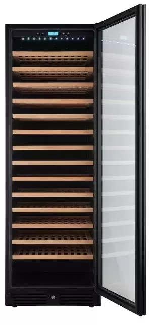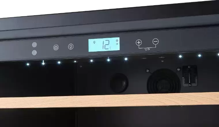 Электронное управление помогает быстро разобраться в том, как функционирует эта модель, и легко настроить все необходимые параметры. На дисплее отображаются данные, которые собирают датчики в камере. Лампочки, расположенные внутри, хорошо подсвечивают бутылки. Всего полок, на которых можно разместить коллекцию, в шкафу 14 шт. Пространство тщательно вентилируется, чтобы воздух не застаивался, не попадали посторонние запахи.