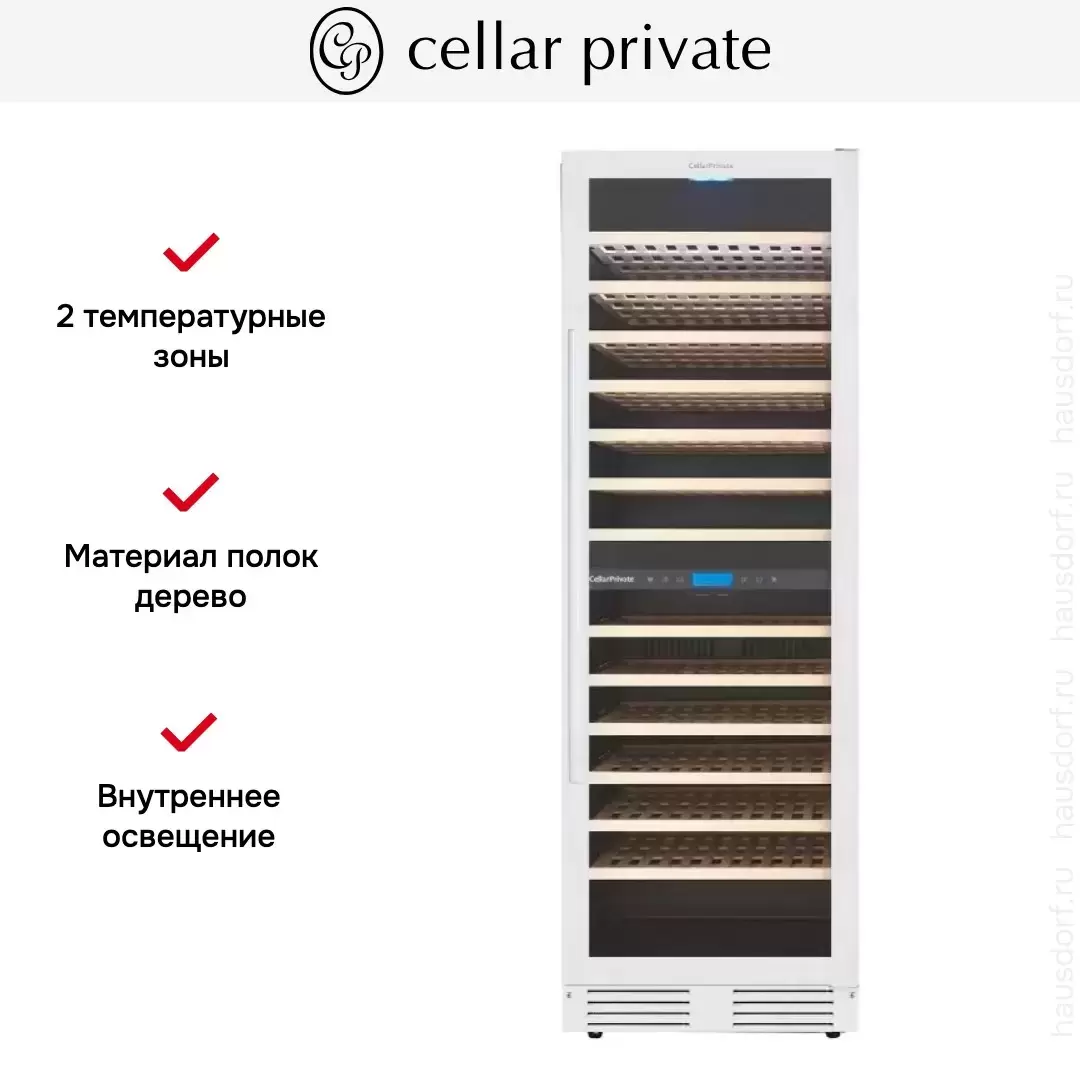 Винный холодильник CellarPrivate CP165-2TW имеет две температурные зоны, в которых одновременно можно хранить разные сорта алкоголя и выставлять разные сочетания настроек. Он встраивается в нишу, что удобно, если у вас ограничен метраж помещения. Количество бутылок, которое можно разместить с учетом полной комплектации и из расчета объема бутылки 0,75 л, — 163 шт.