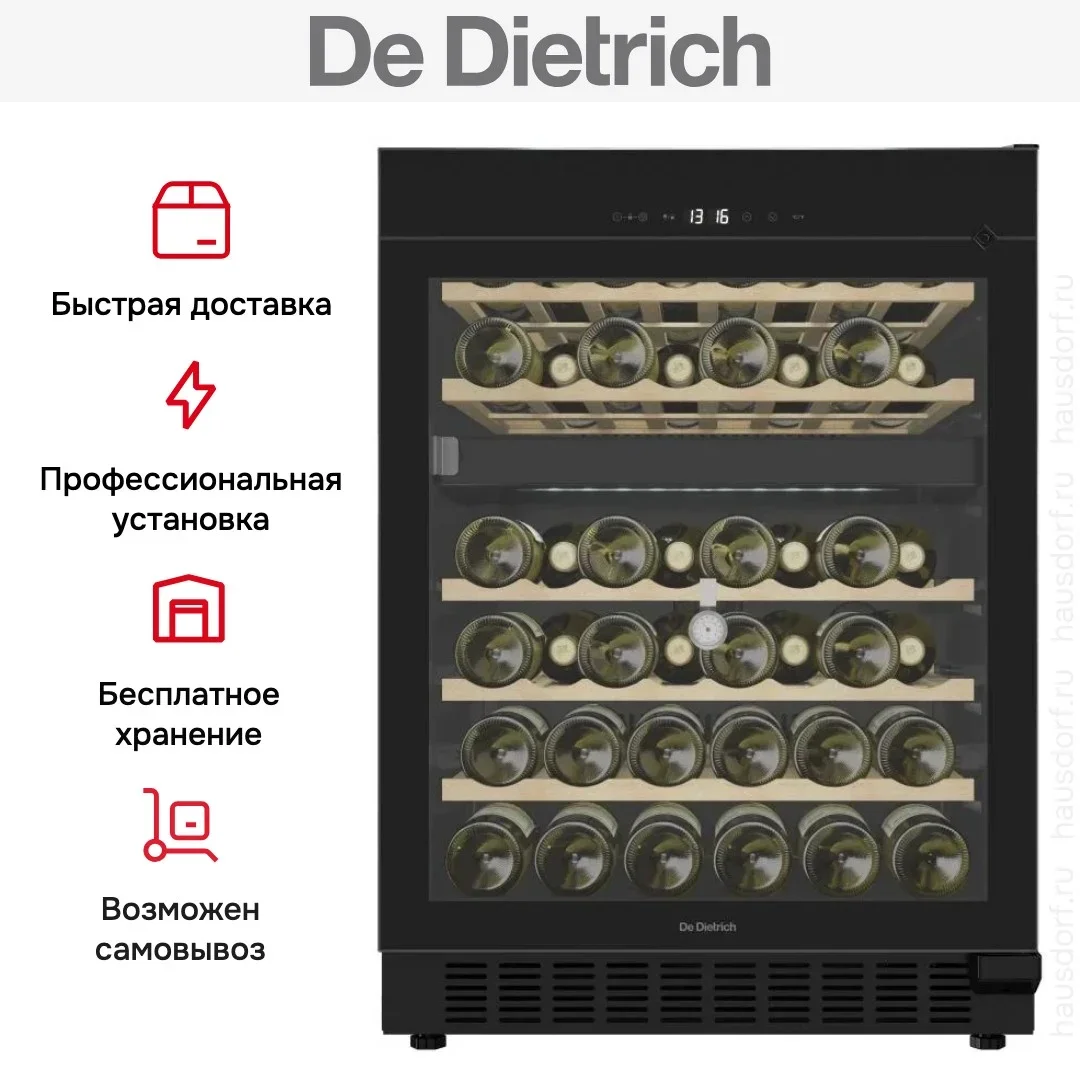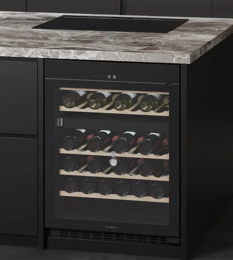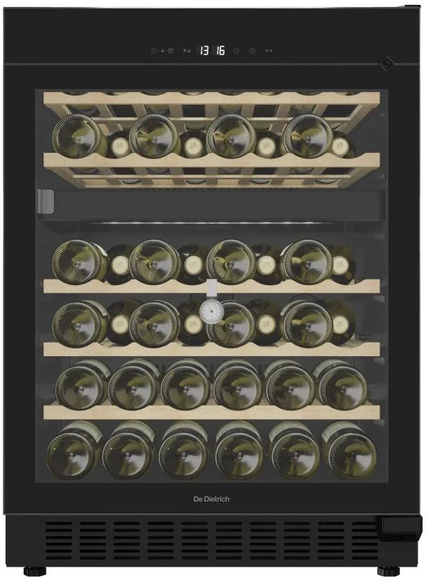 Винный шкаф De Dietrich DUW46DFB выполнен в элегантном дизайне Philharmonie с черной рамкой и стеклопакетом под стеклом, что придает модели строгую презентабельность. Встраиваемый формат с габаритами 82×59.5×57 см обеспечивает аккуратную интеграцию в мебель и экономию пространства. Правосторонний дверной упор и механизм открывания нажатием делают доступ удобным и минималистичным. Регулируемые ножки позволяют выставить прибор строго по уровню, а тёмное стекло защищено от УФ‑излучения и сохраняет эстетичный вид даже при ярком свете.