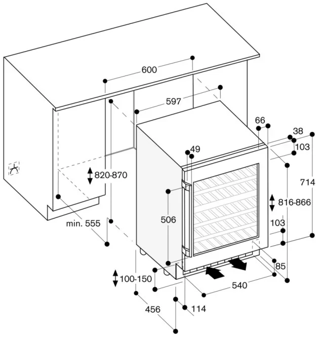 Компрессорная система охлаждения с динамической циркуляцией воздуха и автоматическим размораживанием обеспечивает стабильность микроклимата внутри камеры. Функция увеличения влажности и встроенная вентиляция поддерживают необходимый уровень влаги, что особенно важно для долгосрочного хранения. Угольный фильтр, рассчитанный на обе зоны, эффективно очищает воздух, а фильтр от пыли можно мыть в посудомоечной машине, что облегчает уход за техникой. Для безопасности предусмотрен замок, а также звуковая индикация открытой двери и сбоев в работе. Дверца оснащена возможностью перенавешивания, что позволяет адаптировать устройство под особенности помещения. Плоские петли и необходимость минимального зазора у стены (150 мм) делают установку максимально удобной даже в ограниченном пространстве.