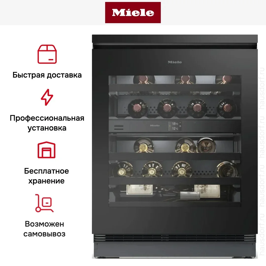 Винный холодильник Miele KWTUS 7074 F имеет две температурные зоны, в которых одновременно можно хранить разные сорта алкоголя и выставлять разные сочетания настроек. Он встраивается в нишу, что удобно, если у вас ограничен метраж помещения. Благодаря компактным размерам данная модель — отличный выбор для офиса, гостиничного номера. Количество бутылок, которое можно разместить с учетом полной комплектации и из расчета объема бутылки 0,75 л, — 32 шт.