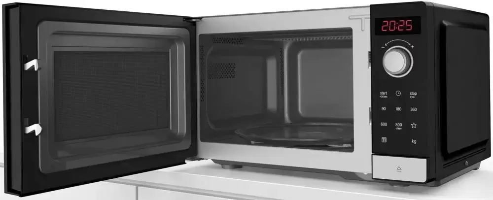 Управление микроволновкой осуществляется с помощью сенсорных и поворотных переключателей. На передней панели расположен LED-дисплей, на котором отображается информация о выбранном режиме и оставшемся времени приготовления. Также на дисплее можно увидеть текущее время. Для удобства установки времени приготовления предусмотрен цифровой таймер.