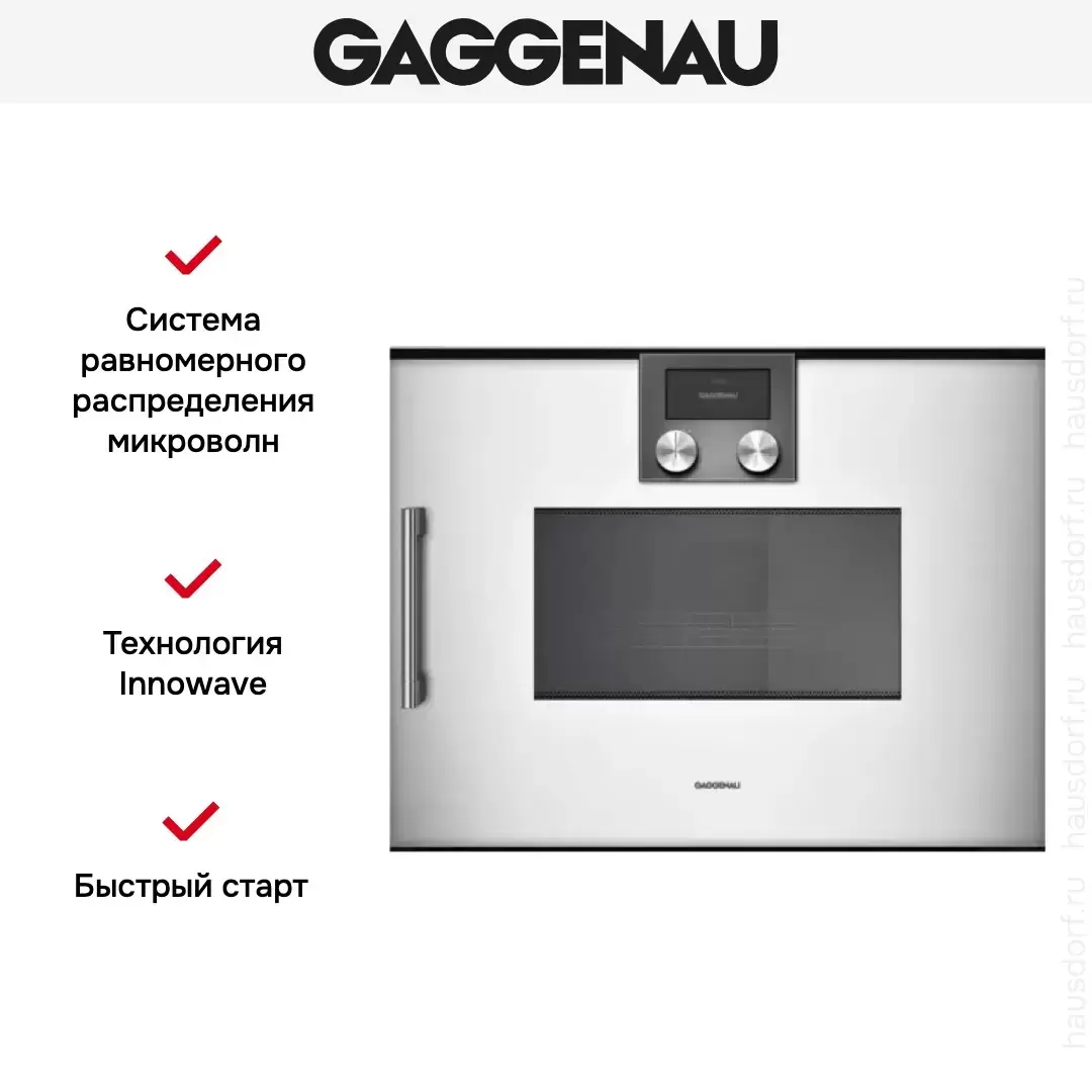 Количество режимов в данной модели Гаггенау: 4 шт. Для обработки продуктов и готовых блюд используются следующие виды нагрева: Микроволны, Гриль, Гриль + конвекция (обдув), Микроволны + гриль, Микроволны + конвекция (обдув). Выберите гриль, чтобы получить поджаристую корочку на мясе или рыбе. Тип гриля в этой микроволновке кварцевый. Конвекция способствует равномерную распространению горячего воздуха по всей камере, поэтому даже если блюдо большое, все его кусочки пропекаются одинаково. Если вы спешите, а еду нужно разогреть, используйте быстрый старт — благодаря ему 30 секунд прибор работает на полной мощности. Автоматические программы для приготовления добавлены производителем также для упрощения работы.