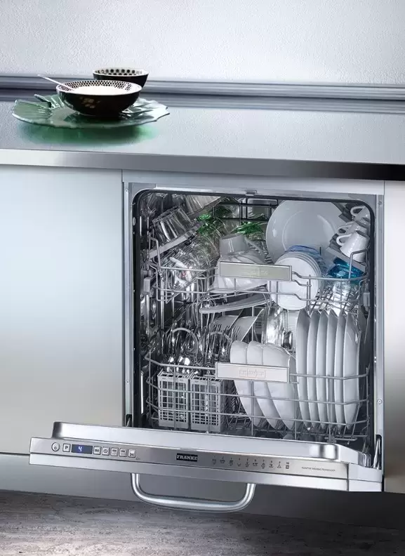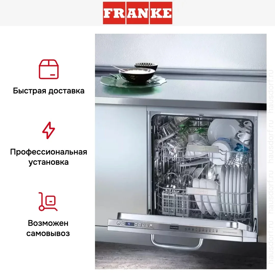 Встраиваемая модель Франке отлично впишется в любой интерьер, главное — правильно выбрать место, чтобы подвести коммуникации. Устанавливается в нишу целиком, полностью закрывается декоративной панелью. Обратите внимание: в комплекте не идет фасад, его необходимо установить самостоятельно. Имеет стандартные размеры, поэтому может не поместиться на очень маленькой кухне. В камеру можно загрузить ограниченное число комплектов: 14 шт. Комплектом считается набор посуды на одного человека, который нужен для полноценного приема пищи: глубокая и плоская тарелки, тарелка для салата, блюдце под чашку, сама чашка, ложка и вилка.