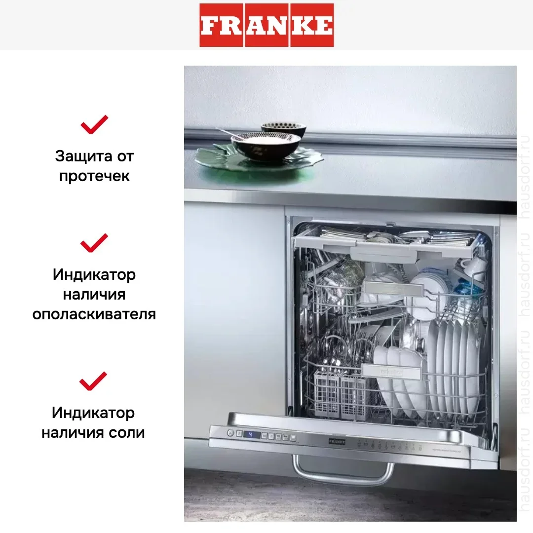 Встраиваемая модель Франке отлично впишется в любой интерьер, главное — правильно выбрать место, чтобы подвести коммуникации. Устанавливается в нишу целиком, полностью закрывается декоративной панелью. Обратите внимание: в комплекте не идет фасад, его необходимо установить самостоятельно. Имеет стандартные размеры, поэтому может не поместиться на очень маленькой кухне. В камеру можно загрузить ограниченное число комплектов: 14 шт. Комплектом считается набор посуды на одного человека, который нужен для полноценного приема пищи: глубокая и плоская тарелки, тарелка для салата, блюдце под чашку, сама чашка, ложка и вилка.