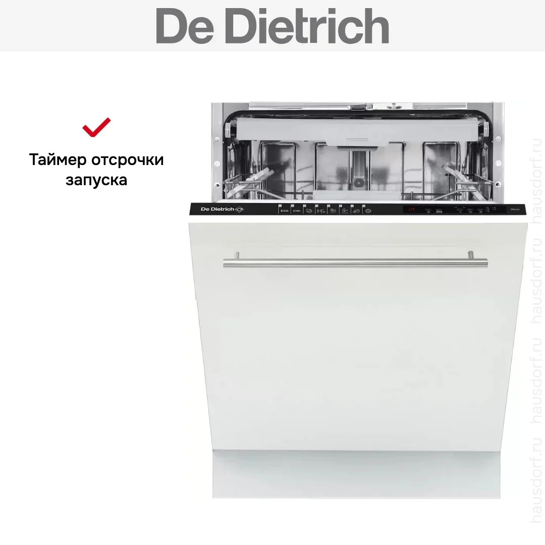 Посудомоечная машина De Dietrich DV1434QJ создана для полного встраивания в кухонный гарнитур и сохраняет единый стиль с фасадами. Ее лаконичный внешний вид позволяет скрыть технику за вашей дверцей, а черная панель управления остается незаметной благодаря закрытой конструкции. Габариты адаптированы к стандартным нишам 82×60×58 см, что упрощает монтаж в типовой кухонный модуль. Высота регулируется в пределах 81.8-86.8 см, а компактная глубина 55 см экономит пространство, не жертвуя вместимостью.