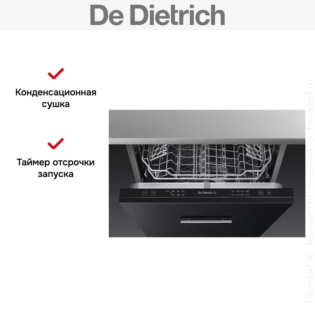 Встраиваемая посудомоечная машина De Dietrich KDLV326J2 создаёт аккуратный и сдержанный акцент в кухне, полностью пряча фронт под ваш фасад. Панель управления в черном цвете расположена за закрытой дверцей, что сохраняет единый стиль интерьера и защищает элементы от случайного нажатия. Корпус и габариты рассчитаны на стандартную нишу 82×60×58 см, что облегчает монтаж в большинстве модульных кухонь. Компактная глубина 55 см позволяет экономить пространство при сохранении полноценной вместимости.