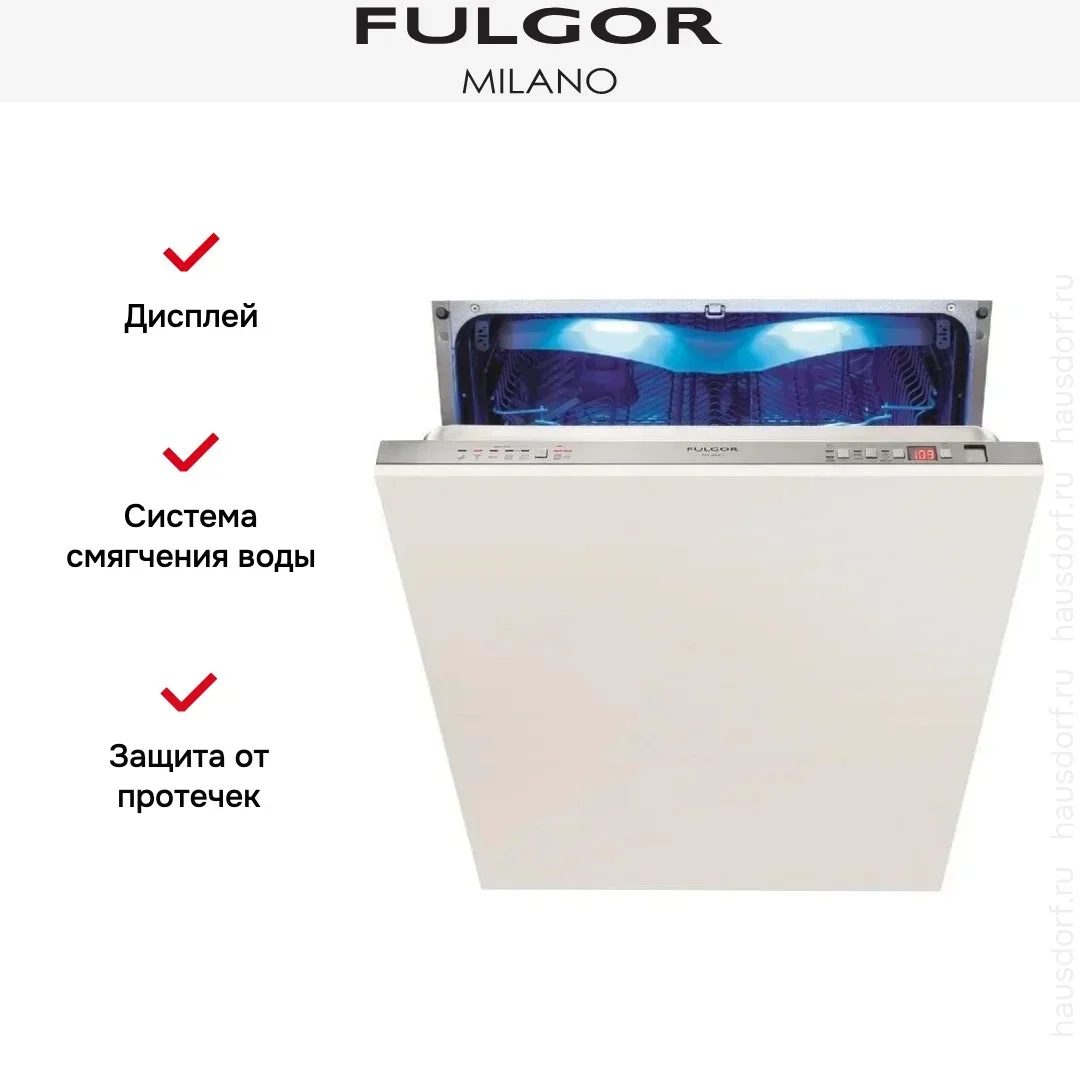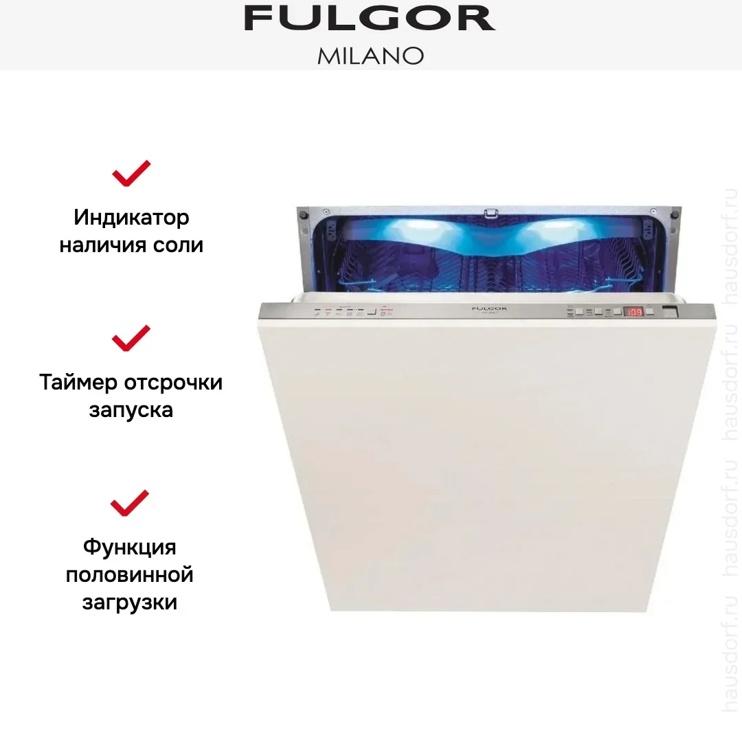 Встраиваемая модель Фулгор Милано отлично впишется в любой интерьер, главное — правильно выбрать место, чтобы подвести коммуникации. Устанавливается в нишу целиком, полностью закрывается декоративной панелью. Обратите внимание: в комплекте не идет фасад, его необходимо установить самостоятельно. Имеет стандартные размеры, поэтому может не поместиться на очень маленькой кухне. В камеру можно загрузить ограниченное число комплектов: 13 шт. Комплектом считается набор посуды на одного человека, который нужен для полноценного приема пищи: глубокая и плоская тарелки, тарелка для салата, блюдце под чашку, сама чашка, ложка и вилка.