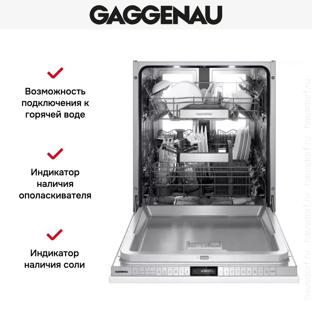 Встраиваемая модель Гаггенау отлично впишется в любой интерьер, главное — правильно выбрать место, чтобы подвести коммуникации. Устанавливается в нишу целиком, полностью закрывается декоративной панелью. Обратите внимание: в комплекте не идет фасад, его необходимо установить самостоятельно. Имеет стандартные размеры, поэтому может не поместиться на очень маленькой кухне. В камеру можно загрузить ограниченное число комплектов: 12 шт. Комплектом считается набор посуды на одного человека, который нужен для полноценного приема пищи: глубокая и плоская тарелки, тарелка для салата, блюдце под чашку, сама чашка, ложка и вилка.