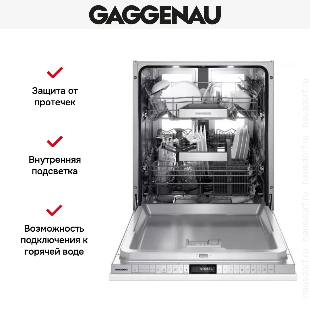 Встраиваемая модель Гаггенау отлично впишется в любой интерьер, главное — правильно выбрать место, чтобы подвести коммуникации. Устанавливается в нишу целиком, полностью закрывается декоративной панелью. Обратите внимание: в комплекте не идет фасад, его необходимо установить самостоятельно. Имеет стандартные размеры, поэтому может не поместиться на очень маленькой кухне. В камеру можно загрузить ограниченное число комплектов: 12 шт. Комплектом считается набор посуды на одного человека, который нужен для полноценного приема пищи: глубокая и плоская тарелки, тарелка для салата, блюдце под чашку, сама чашка, ложка и вилка.