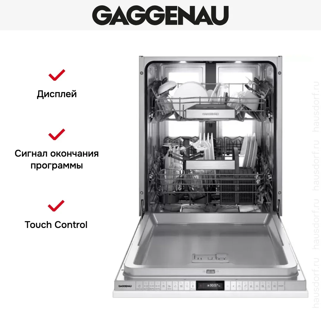 Встраиваемая модель Гаггенау отлично впишется в любой интерьер, главное — правильно выбрать место, чтобы подвести коммуникации. Устанавливается в нишу целиком, полностью закрывается декоративной панелью. Обратите внимание: в комплекте не идет фасад, его необходимо установить самостоятельно. Имеет стандартные размеры, поэтому может не поместиться на очень маленькой кухне. В камеру можно загрузить ограниченное число комплектов: 12 шт. Комплектом считается набор посуды на одного человека, который нужен для полноценного приема пищи: глубокая и плоская тарелки, тарелка для салата, блюдце под чашку, сама чашка, ложка и вилка.