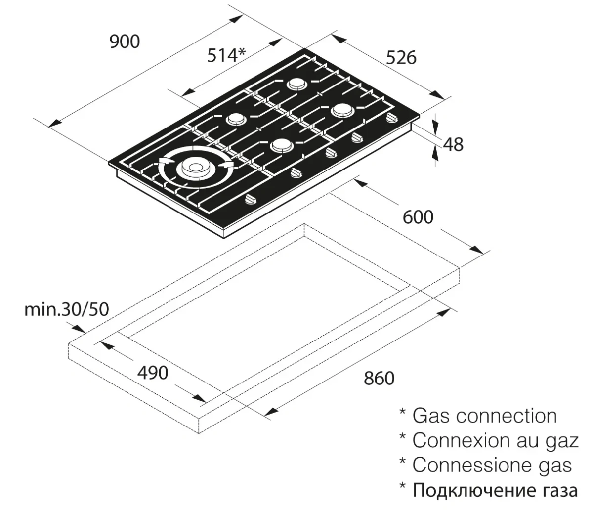 Модель шириной 90 см можно установить в просторной кухне. Слева на поверхности располагается уникальная конфорка Super Vario Wok с двумя радиусами пламени и косым направлением нагрева для лучшего охвата дна посуды. 4 гибридные конфорки А+ приподняты над поверхностью, что обеспечивает лучшую подачу воздуха для эффективного нагрева. Механическая панель управления позволяет плавно регулировать интенсивность пламени. Поворотные регуляторы не нагреваются во время работы. Конфорки из материала Keradur очень удобны в очистке. Для подключения к баллонному газу в комплект входят форсунки.