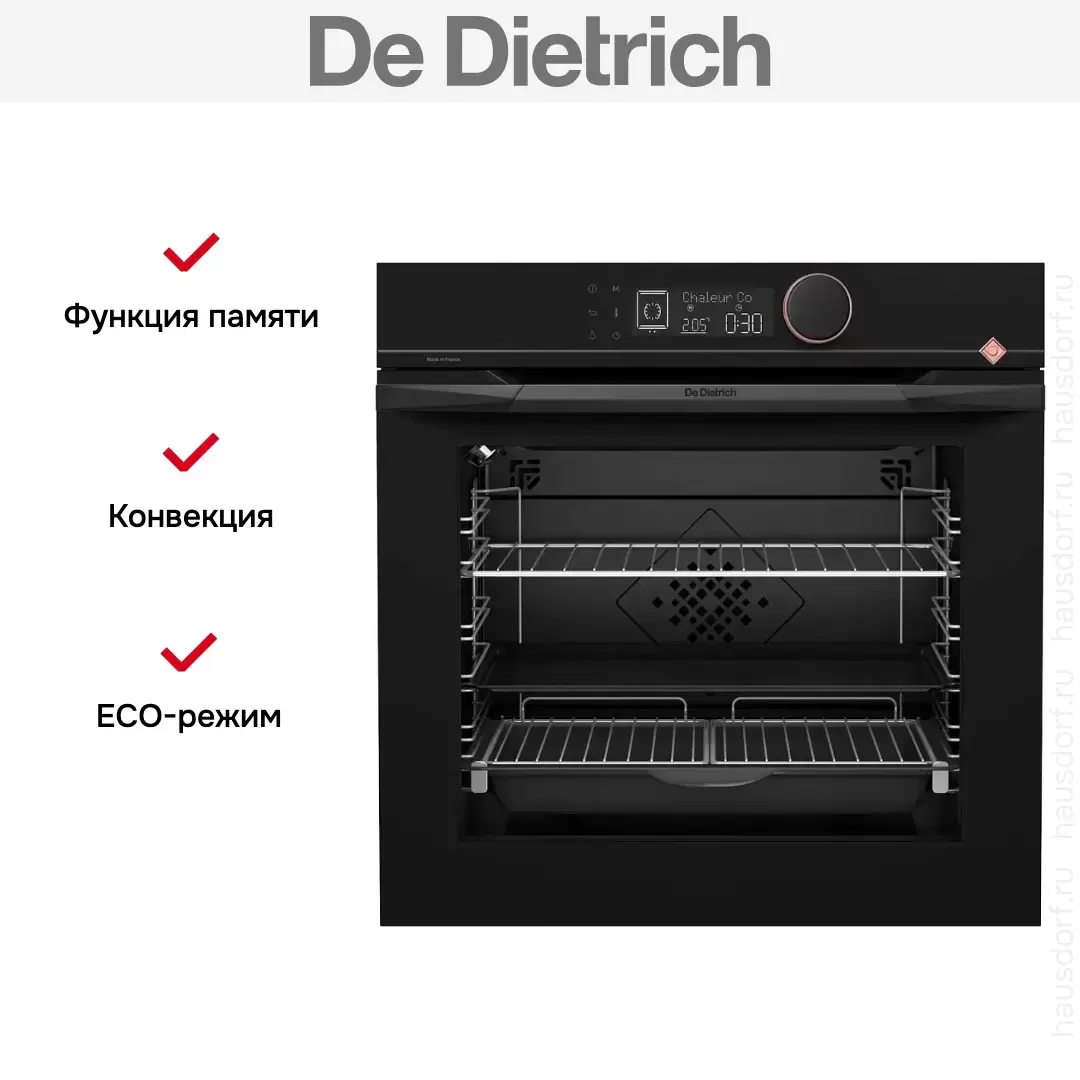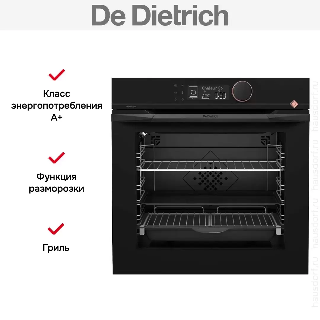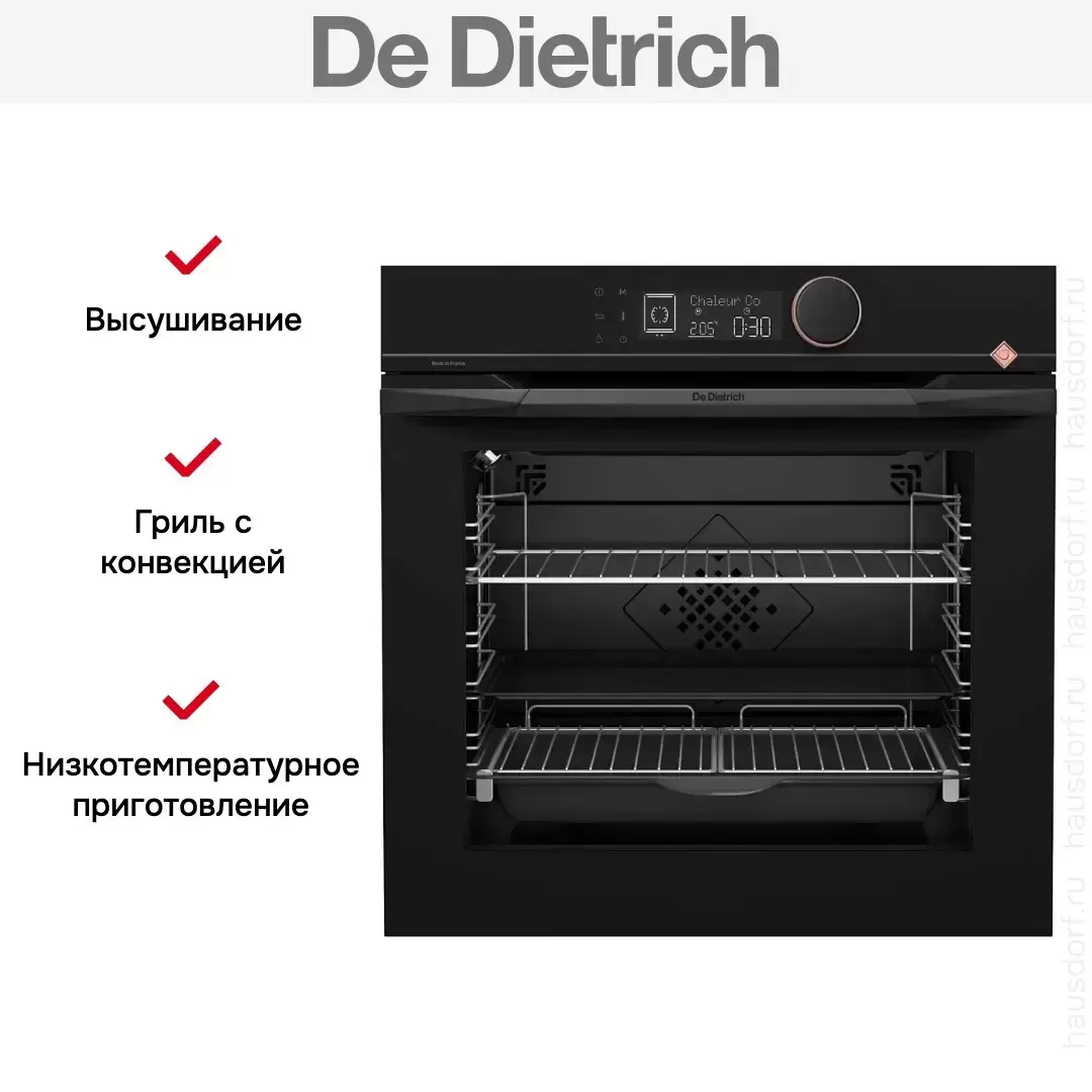 Духовой шкаф De Dietrich DOP4543H сочетает стильный строгий внешний вид и продуманную эргономику для современной кухни. Его черный корпус и медная фурнитура придают интерьеру статусный и лаконичный акцент. Откидная дверь с системой доводчика и четырьмя стеклами обеспечивает плавное закрытие и заметно снижает нагрев внешней панели, что важно для безопасности в доме с детьми. LED-дисплей и сенсорные кнопки в сочетании с поворотными регуляторами объединяют интуитивное управление и тактильный контроль, удобный при приготовлении сложных блюд.