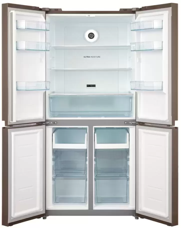 Холодильник Korting KNFM 81787 GB — отдельно стоящая модель с четырьмя распашными дверцами French Door. Морозильная камера состоит из двух отделений и находится снизу. Модель относится к климатическому классу SN-N-ST-T и может использоваться при температуре окружающей среды от + 10 до +43 градусов. Холодильник в корпусе оригинального золотисто-бежевого цвета с фронтом из эффектного закаленного стекла имеет общий объем 456 литров. На фасаде устройства находится электронная сенсорная панель управления с цифровым дисплеем и кнопками регулировки температуры.