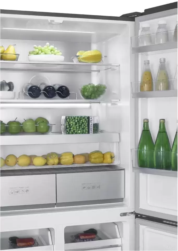 Специальная зона свежести предназначена для правильного и более длительного хранения овощей, фруктов, зелени. В ней поддерживается околонулевая температура, поэтому продукты не перемораживаются и не пересыхают. Система охлаждения этого холодильника — динамическая.