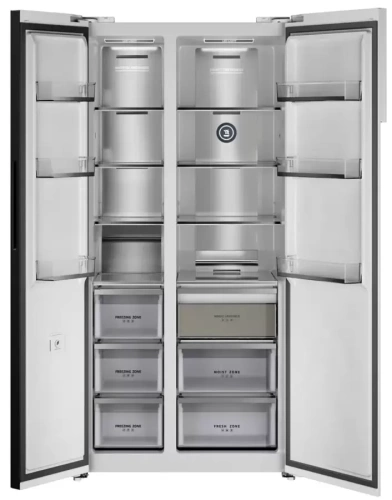 Уникальность в расположении морозильной камеры — Side-by-Side. Это означает, что морозильная и холодильная камеры расположены рядом, что обеспечивает легкий доступ к обоим камерам. Объем холодильной камеры составляет 294 литра, а морозильной — 308 литров, что позволяет хранить большое количество продуктов.