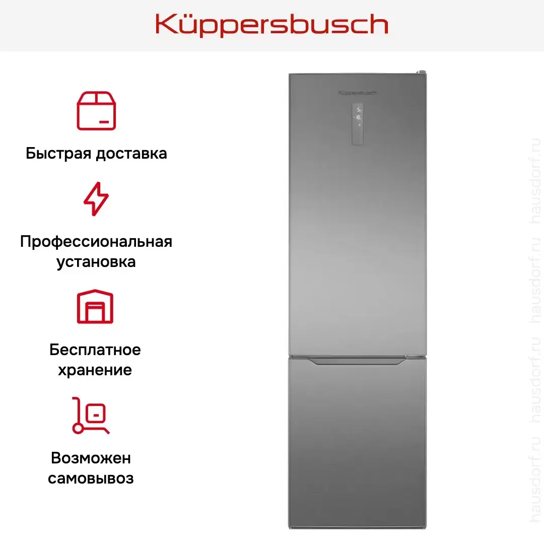 Kuppersbusch FKG 6500.0 E — отдельно стоящий двухкамерный холодильник с морозильной камерой снизу. Модель высотой 2 метра с удобной встроенной ручкой представлена в оттенке нержавеющей стали. Общий объем холодильник достигает 330 литров. На дверце расположена сенсорная панель управления с дисплеем, которая поможет регулировать температуру в отделениях с высокой точностью и отслеживать состояние прибора. Капельная система размораживания максимально упрощает очистку внутренней поверхности холодильной камеры. В морозильнике применяется не менее удобная система размораживания No Frost. Прибор оснащен функцией суперохлаждения с автоматическим отключением через 6 часов.