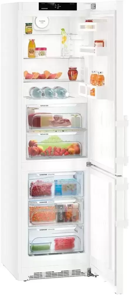 Liebherr CBN 4815 — отдельностоящий двухдверный холодильник из серии BluPerformance. Модель оборудована сенсорной панелью управления с монохромным TFT-дисплеем, отображающим текущую температуру в каждой из зон охлаждения. Система NoFrost исключает заиндевение камерных стенок, что упрощает обслуживание прибора. Сменный уплотнитель дверец обеспечивает чистоту и безопасность хранения пищевых продуктов. Зона свежести из двух выдвижных контейнеров Dry Safe и HydroSafe гарантирует бережное хранение продуктов без замораживания в условиях пониженной и повышенной влажности. Антибактериальный угольный фильтр предохраняет от неприятных запахов. При отключении электричества морозильная камера поддерживает заморозку продуктов в течение 24 часов. Для экономии места прибор можно устанавливать вплотную к стене.