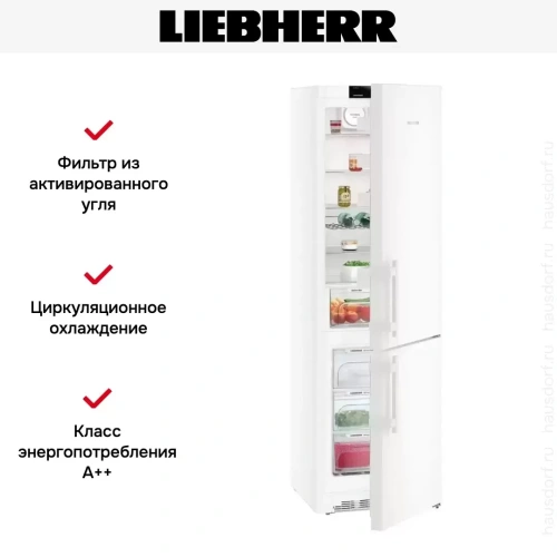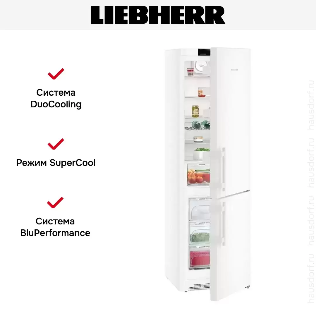 Liebherr CN 4835 — двухкамерный холодильник объемом 361 л. Модель из серии BluPerformance при стандартной высоте 200 см и ширине 60 см отличается внушительным объемом 391 литр и может быть установлена вплотную к стене. В холодильной и морозильной камере имеется система размораживания NoFrost без образования наледи. Система DuoCooling с двумя раздельными контурами охлаждения дает возможность точной установки температуры для каждого отсека. В холодильной камере находятся полки из закаленного стекла, в том числе складные и регулируемые, и контейнер BioCool с регулировкой влажности. Морозильное отделение оснащено системой VarioSpace, которая позволяет вынимать ящики и полки для размещения крупных продуктов. Длительность хранения в замороженном виде при отключении электропитания составляет 24 часа, а производительность — 16 кг продуктов в сутки.