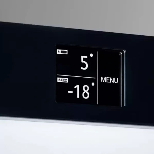 Регулировать температуру в холодильной камере пределах от +1 до +9°C позволяет электронная панель управления с сенсорным монохромным TFT-дисплеем 2,4 дюйма. Элементы быстро реагируют на активацию, поэтому настройка параметров происходит быстро и понятно. В обеих камерах предусмотрено удобное автоматическое и No Frost размораживание. Пять полок из закаленного стекла выдерживают большие нагрузки, четыре из них могут регулироваться по высоте. Они легко очищаются от загрязнений, выглядят стильно и обеспечивают хороший обзор содержимого. В морозильной камере для хранения предназначаются контейнеры FrostSafe с крышками и прозрачным фронтом: холод в них сохраняется при частом открывании дверцы. Неприятные запахи устранит фильтр из активированного угля.