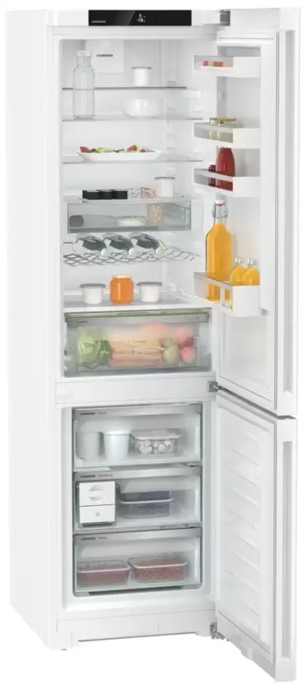 Liebherr CNd 5723 Plus NoFrost — холодильник белого цвета высотой 201 см с нижней морозильной камерой, встроенной ручкой и фасадом из стали. Отдельно стоящая модель может устанавливаться вплотную к стене, а вентиляция через лицевую панель гарантирует безопасное размещение в нише. Общий объем составляет 383 литра, из них 94 приходится на морозильную камеру.